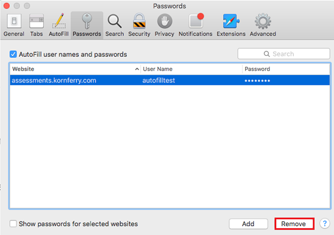 Alternatively, keep the User names and passwords option checked, and click on the Edit button (or simply navigate to the Passwords section). On the subsequent Passwords page, click and highlight the entry for “assessments.kornferry.com” and click on the Remove button (as depicted below).