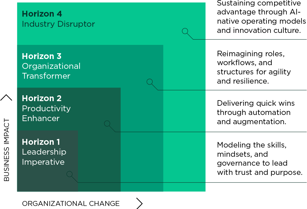 Our four horizons of value creation describe four distinct areas of impact driven by intentional, informed AI implementation. We use this framework to help organizations identify where they are on their journey toward sustainable AI transformation and define specific actions they can take to reach the next horizon.