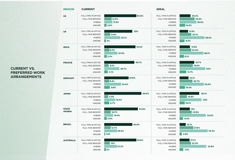 In Brazil, for example, only 12% are happy with full-time office life, but in Japan, that jumps to 36%.