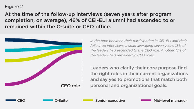 Alumni interviewed reported being driven by both clarity and a strong sense of purpose about what they wanted to achieve. Leaders who clarify their core purpose can more proactively find the right fit roles in their current organizations and say yes to promotions that match both personal and organizational goals. More than 46% of those interviewed ascended to or remained in C-suite or CEO roles.