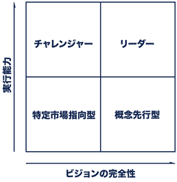 マジック・クアドラントでは、成長が著しく、テクノロジー・プロバイダーの差別化が明確な市場について、競合するプロバイダーの位置付けを以下の4タイプに分類してグラフィカルに示します。