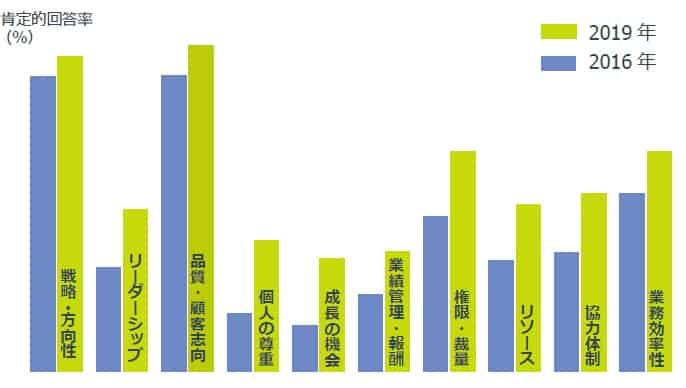 比較すべきは「他社」と「自社」である。まず他社については、グローバル企業であるAGCは日本ではなくグローバルの数値をベンチマークすることで外部競争力を見極め、どうすればグローバル好業績企業の水準に達することができるか思案した。もう一つ比較すべきは、自社の過去データだ。前回調査と比べて向上/低下した項目はどこか、前回調査後に取り組んだ改善活動の成果は出たか。AGCの2019年調査結果について言えば、前回2016年調査時の改善活動が実を結び、2019年については全カテゴリーで改善が見られた。
