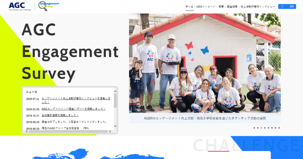 現場の理解を得る上で鍵となるのが経営陣の巻き込みである。AGCでは 2025年のありたい姿として「人財で勝つ会社」を掲げており、高い意欲を持つ人財が果敢にチャレンジできる組織風土の醸成に取り組んでいる。2019年調査でも、課題や仮説に基づき調査を設計し、調査を通してグループ全体の組織風土を理解し、今後の経営に役立てるための手段とエンゲージメント調査を位置づけたのだ。そして、従業員向けにエンゲージメント調査を周知するためのウェブサイトを立ち上げ、CEO自らがメッセージを発信した。人事施策ではなく経営施策としたことが、高い回答率の要因となったと言える。