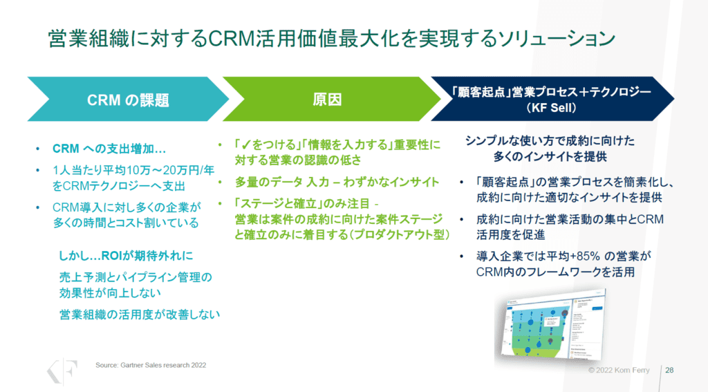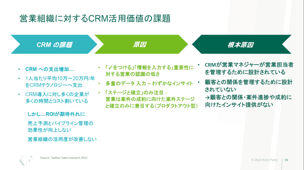 「CRMの課題は、導入に対して多くの時間とコスト割いていますが、ROIが期待外れになっていることにあります。売上予測とパイプライン管理の効果性が向上せず、営業組織の活用度も改善していない。原因としては『✓をつける』『情報を入力する』ことの重要性への営業の認識の低さが関係しています。営業はその行為に対する見返りが少ないと感じている。そして、営業は案件の成約に向けたステージと確率のみに着目する傾向が非常に強くなっています」