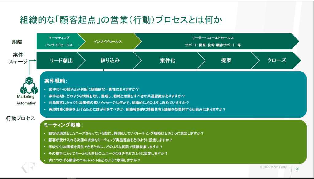 - ダイナミックプロセス:市場・顧客意思決定プロセスの変化傾向を基に行動プロセスを定期的に変更する(セールスオペレーション主導)