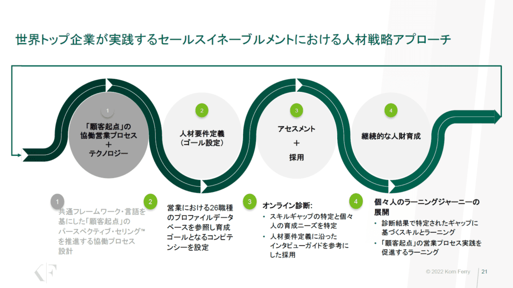 ではこうした状況を踏まえて、世界トップ企業ではどんな人材戦略アプローチを行っているのか。世界トップ企業では、ステップとして「1『顧客起点』の協働営業プロセス+テクノロジー」「2 人材要件定義(ゴール設定)」「3 アセスメント+ 採用」「4 継続的な人財育成」といった流れが見られている。