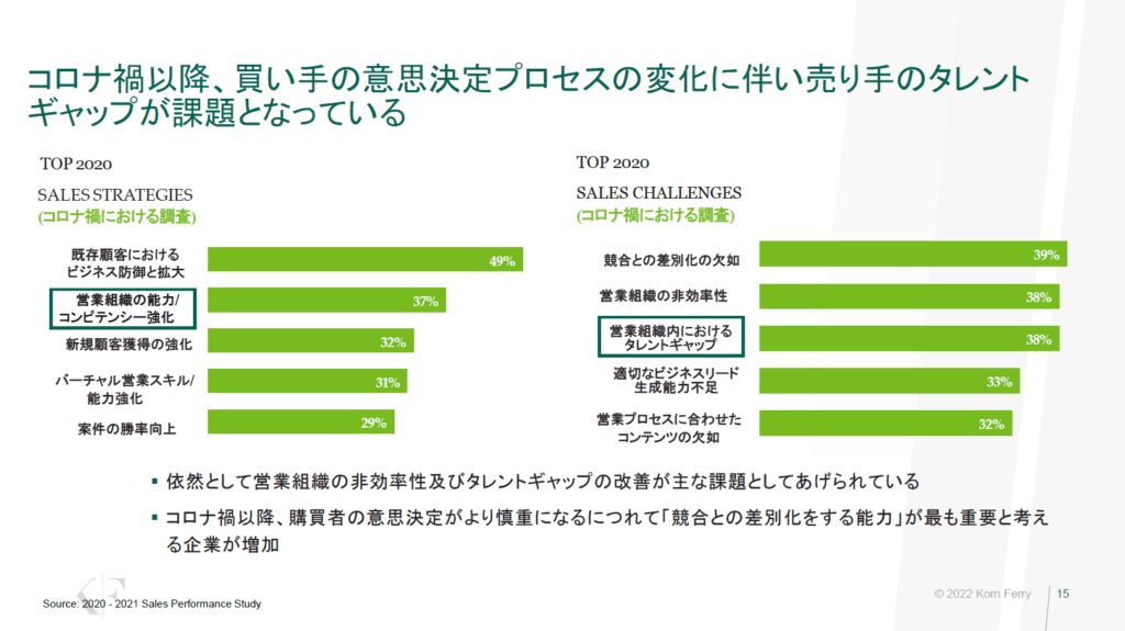 「営業の戦略では、『新規顧客獲得の強化』を『既存顧客におけるビジネス防御と拡大』が抜き、トップに踊り出ました。これは以前、4位、5位ぐらいに位置していた項目です。そして、『営業組織の能力/コンピテンシー強化』が2位に上がってきています。営業の課題点については『競合との差別化の欠如』が1位に躍り出ました。これはコロナ以前であればTOP5圏外でした。また、『営業組織内におけるタレントギャップ』が3位に入った点が大きな変化といえます」
