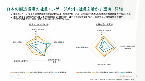 ここからは本セミナーの本題とも言える製造現場のエンゲージメントについて述べた。今回コーン・フェリーでは日本国内の大手製造業17社と現業職4.5万人のデータを分析した。まず「社員エンゲージメント」と「社員を活かす環境」をグローバル、グローバルの現業職(主に製造業)、日本、日本の現業職で比較した。グローバル全体で見た場合、大きな差はなかった。一方で、日本国内の場合では、日本平均と現業職との間のスコアの開きが大きく、特に「社員を活かす環境」、つまり働きやすさの面での水準の低さは日本の製造現場固有だと言える。これは過去の成功体験が時代と共に古くなり、効果的な結果を出せない状態にある、と岡部氏は分析する。