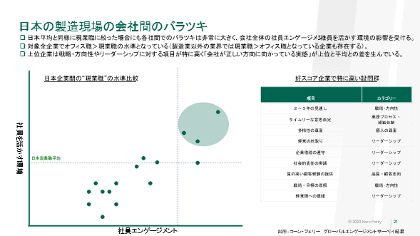 では高い水準の企業とはどういった項目で高いのかという観点で見てみると、2~3年の見通しやタイムリーな意思決定、個人の尊重、リーダーシップに関連する経営の舵取りや社会的責任の実践、経営陣への信頼など、項目を見ると、会社が正しい方向に進んでいる、経営陣の判断やそこから発せられるメッセージに納得感があるなど、メッセージが製造現場の社員もきちんと感じられている会社は好スコア企業であった。つまり、上位企業は戦略・方向性やリーダーシップに対する項目が特に高く「会社が正しい方向に向かっている、やっていることに安心感があると実感できる」ことが上位と平均の差を生んでいるということになる。