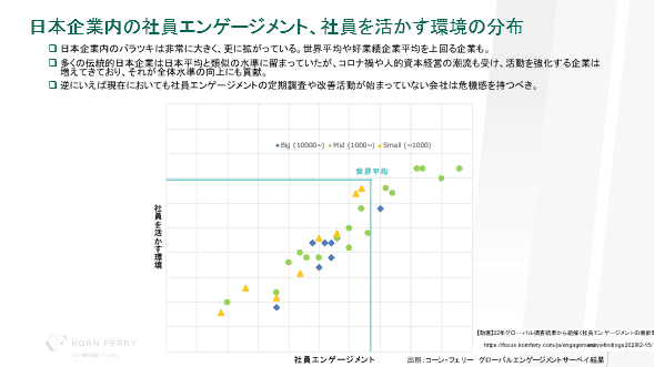 一方で、日本企業における「社員エンゲージメント」と「社員を活かす環境」の分布を見ると、日本企業内のバラツキは大きく、更に拡がっていることが分かる。コロナ前より上の会社はさらに上がり、下の会社はさらに下がるという二極化の傾向が強くなっているのだ。コロナ禍で「社員を活かす環境」に力を入れた企業は、コロナ後もそうした活動を継続しているが、その場しのぎの対応しかしていない企業は元の状態に戻っているのである。全体として上がり調子ではあるので、社員エンゲージメントの定期調査や改善活動を始めていない会社は危機感を持つべきだと岡部氏は強調した。