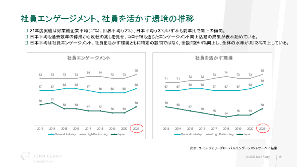 推移を見ると、実はエンゲージメント値は上昇傾向にある。グラフの2021年(2021年中頃~2022年前半までの集計値)頃より好業績企業平均、世界平均、日本平均共に向上の傾向がみられる。日本平均は社員エンゲージメント、社員を活かす環境共に、全設問が2~4%向上し、全体の水準が共に3%向上している。トレンドとして、世界も日本もエンゲージメントを活かす環境が整ってきていることが見て取れる。