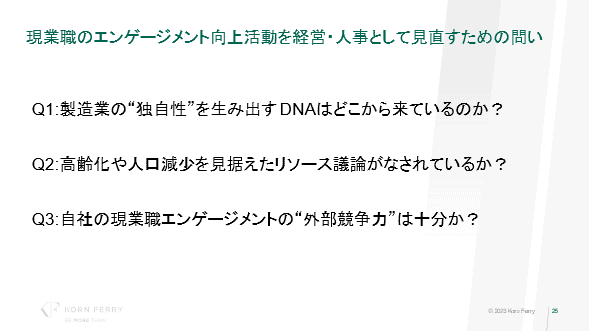 最後に、岡部氏は経営・人事として現場のエンゲージメントを向上させるための3つの問いを提示して、説明を締めくくった。