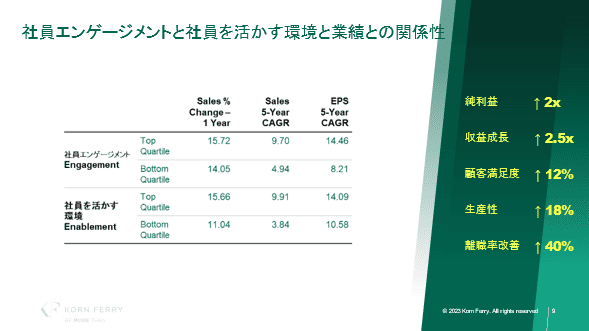 なぜ世界中で、エンゲージメントに関する取り組みが行われているかというと、企業業績との連動性が高いからだと岡部氏は言う。世界中でエンゲージメント調査を長く実施してきたコーン・フェリーでは、会社に対する長期的なロイヤリティや貢献意欲が醸成されているかを測る「社員エンゲージメント」と、適材適所や働きやすさで測る「社員を活かす環境」という枠組みで捉えている。そして、「社員エンゲージメント」と「社員を活かす環境の高い」会社と低い会社を比べると5年間の売り上げの伸び率、1株当たり純利益率は顕著な差がみられることがコーン・フェリーの調査から明らかになっている。より良い組織風土、高いエンゲージメントが企業業績にポジティブに影響を与えることは明確で、こうした取り組みが世界中で強化されてきているという。