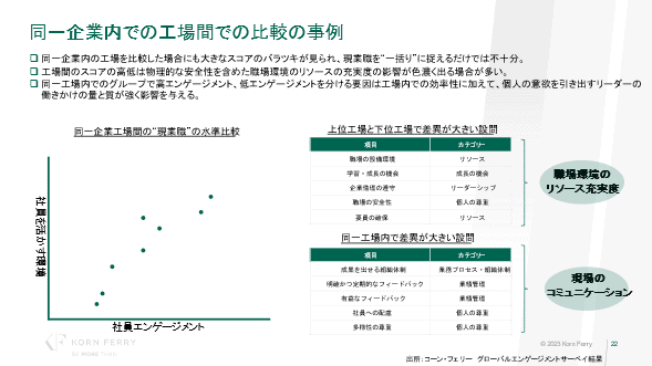 こういった部分はすぐに変更できるものではない、と岡部氏は指摘する。しかし、同一工場内で、差異を生む組織が分かれていることがあるが、それを分析するとフィードバックがきちんとされているか、社員への配慮や多様性の尊重など、個人の尊重がされているか、成果を出せる組織体制のような仕事の進め方や工程などの業務プロセスも関係するし、それは現場のコミュニケーション、人間関係等のソフトな部分が、工場内でも差が生まれていることが共通なポイントとしてわかるという。