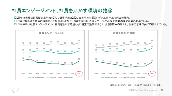 「日本平均も、過去数年の停滞から反転の兆しを見せ、コロナ禍も通じたエンゲージメント向上活動の成果が表れ始めています。日本平均は社員エンゲージメント、社員を活かす環境ともに、特定の設問ではなく、全設問で2~4%向上し、全体の水準が共に3%向上していました。日本で、コロナ禍は決して喜ばしいことではありませんでしたが、それによって働き方や働く意味、会社と組織の関係性において、いろいろな施策が実行されました。その結果として、全体的な水準が高まったと思われます」