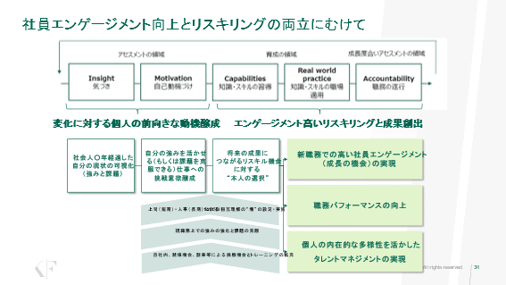 「これは人事から見ると、その人が内在的に持っているものの違いによってマネジメントすることになり、より一歩進んだ多様性を生かしたタレントマネジメントになっていきます。また、仕事が持つ特性と本人の特性がフィットすると、そうでない場合と比べてエンゲージメントが13倍になるといった研究結果もあります。その意味では、組織や上司が協力し、個人の強みを活かせる、もしくは課題を克服できる仕事への挑戦意欲を醸成し、将来の成果につながるリスキルの機会への“本人の選択”を行える場をつくることが重要です。例えば、上司(短期)・人事(長期)による1o1での相互理解の“場”の設定や実施が考えられます」