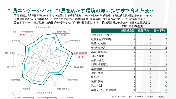 次に岡部氏は、社員エンゲージメント、社員を活かす環境の原因指標までを含めた変化について解説した。12の原因指標ごとにレーダーチャートの形式でポイントを比較すると、好業績企業&世界平均と日本平均の差異は引き続き「業務プロセス・組織体制」「戦略・方向性」「品質・顧客志向」の三つで大きくなっていた。