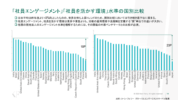 次に岡部氏は「社員エンゲージメント」「社員を活かす環境」水準の国別比較を紹介した。日本平均は昨年度より+3%向上したものの、世界全体も上昇トレンドのため、国別比較においては引き続き最下位に留まっている。