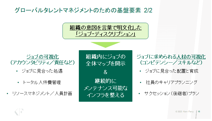 ジョブ型のもう一つの難関がJDのメンテナンスである。仕事の変化に応じて継続的にメンテナンスするには人事部門ではとても追いつかない。職務について一番理解している現場マネージャーが戦略戦術の変更に合わせてJDと求める人材像を言葉で表現できる。そういう仕組み作りが不可欠だと岡田氏は主張する。これによるメリットは、組織目線ではジョブの可視化、社員目線では人材の可視化によりキャリアプランニングがしやすくなるということ。JDという形で明文化することで、組織・社員を不可分なものとして定義し、一貫性のあるタレントマネジメントの基盤を作っていくことができる。