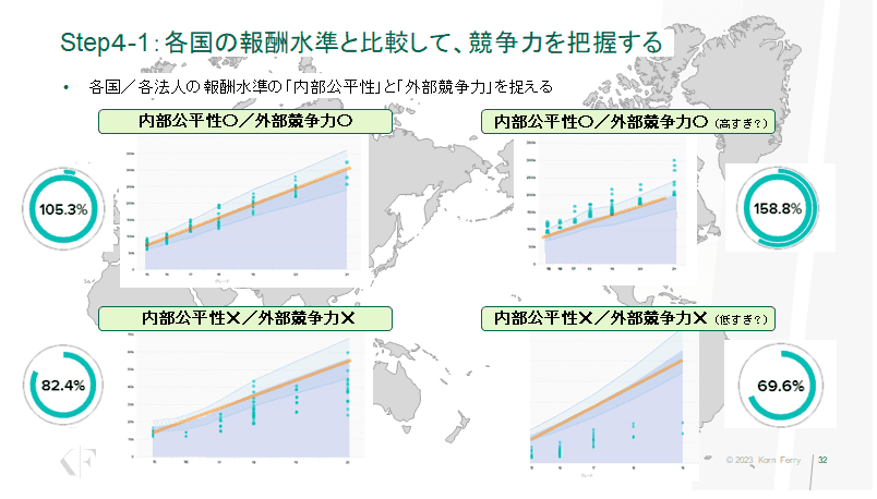 ステップ4では比較対象の報酬水準に対して、自社が高いのか低いのかを示す数値(コンパレシオ)というアウトプットが出てくる。もう一つは比較対象とするマーケット水準と、ターゲット水準、その上下どのくらいの範囲で収めたいのかというサラリーレンジを表示し、その中に現職者がどの程度おさまっているのかを視覚的に表示。このように各国の報酬の現状を視覚的にとらえている日本企業は意外に少ないと岡田氏は指摘する。これができると、色々な国や法人の現状をとらえ、競争力を把握することができるようになる。