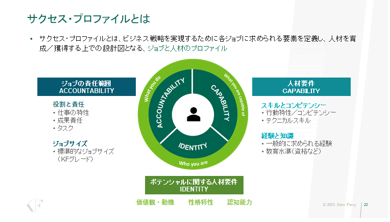 ジョブの責任範囲、成果責任、ジョブサイズが定義され、それに対し、どういったスキルを持った人材がここにフィットするかという人材要件が整理されてくる。また人材としての特性、価値観や性格特性などもセットになって定義されたものが一つのプロファイルとしてあり、今現在、コーン・フェリーでは6000以上のサクセス・プロファイルをライブラリに保持している。これにより、ジョブの明文化に費やす労力と時間を大幅に短縮することができる。