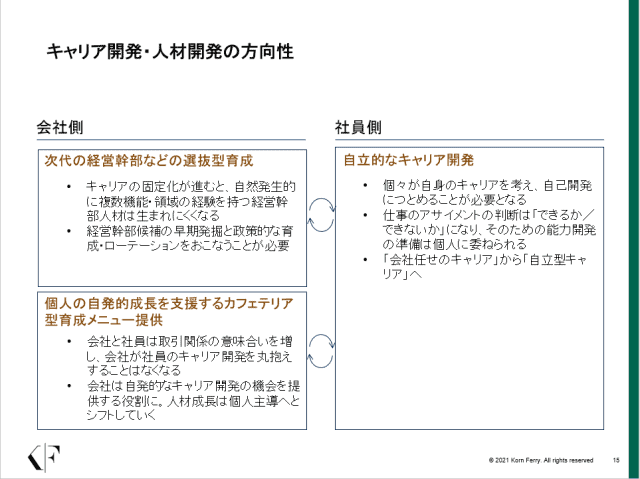 そのため企業と社員で各々、キャリア開発・人材開発の方向性を考えておく必要がある。会社側に必要なことは二つある。一つ目は次代の経営幹部などの選抜型育成だ。キャリアの固定化が進むと、自然発生的に複数機能・領域の経験を持つ経営幹部人材は生まれにくくなる。経営幹部候補の早期発掘と政策的な育成・ローテーションをおこなうことが必要だ。二つ目は個人の自発的成長を支援するカフェテリア型育成メニューの提供だ。会社と社員は取引関係の意味合いを増していき、会社が社員のキャリア開発を丸抱えすることはなくなる。そのため、会社は自発的なキャリア開発の機会を提供する役割を負い、人材成長は個人主導へとシフトしていく。