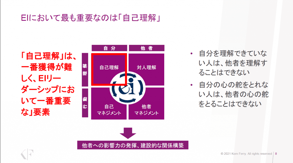 EIには「自己理解、対人理解、自己マネジメント、他者マネジメント」という四つの構成要素がある。この中で「自己理解」は一番獲得が難しく、EIリーダーシップにおいて一番重要な要素といえる。「自分を理解できていない人は、他者を理解することはできません。自分の心の舵をとれない人は、他者の心の舵をとることはできない。では本当の意味で自分を理解するとはどういうことか。意外に自己理解は今のリーダーが実践していない要素といえます」