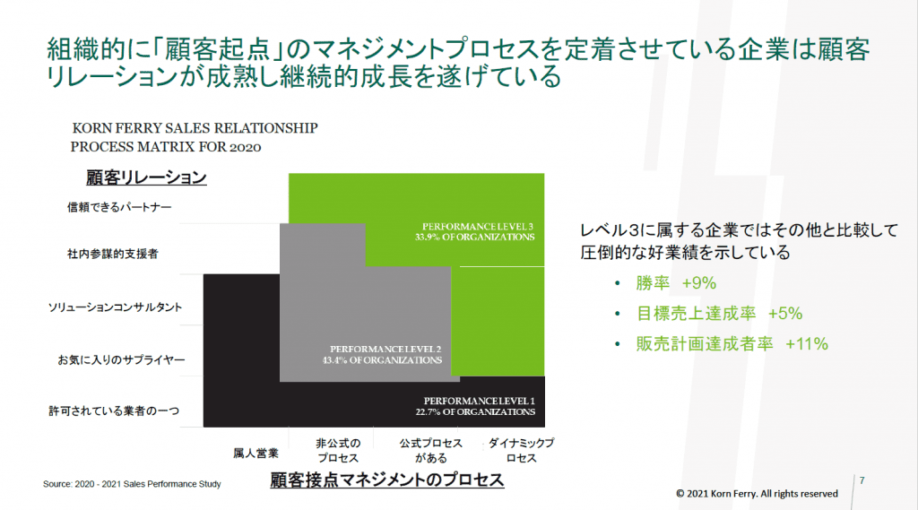 「全体の34%は緑部分に入っています。この部分は非常に組織的なプロセスをもってマネージしつつ、非常に高いレベルでリレーションを構築している企業です。ここに属する企業は、他と比較して圧倒的な好業績を示しています。勝率は9%高く、全社的な売り上げ達成率は5%高く、販売計画達成者率も11%高い。顧客が望む期待値を実現することに組織的に取り組む企業は、現在においても成長を遂げているし強いということです。その意味でも、顧客起点で自発的な行動を取れることが非常に大切な時代になっていると感じます」