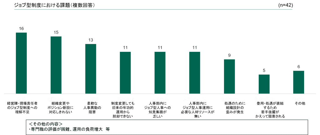 (4)今後の課題今後の課題は,「経営陣・現場責任者のジョブ型制度への理解不足」「組織変更やポジション新設に対応しきれない」「柔軟な人事異動の阻害」などが主に挙げられた。ジョブ型人事制度は,組織設計や人員配置と密接に関わりのある仕組みになる。職能資格制度においては,職務と処遇が切り離されているため,特段の制約なく組織変更や柔軟な人事異動ができた。役割等級制度もジョブ型制度よりは,職務と処遇の結びつきが緩やかなため,一定の自由度があったといえる。しかし,ジョブ型制度においては,組織変更や人事異動が処遇に直結するため,より組織や人員配置に向き合うことが求められる。戦略を実行するために,最適な組織設計を行い,適切な人材を配置することが大原則になる。処遇のための組織設計や思いつきの人事異動など,もってのほかということになる。ジョブ型人事制度においては,効率的に組織が設計されているとともに,人事異動や登用も計画的に実施すべきである。だからこそ,経営陣・現場責任者の理解不足や組織変更・人事異動に関する課題意識が挙がっているものと推察される。これは,健全な課題意識であり,ジョブ型制度の導入を契機に,より戦略的に組織設計や人事異動を行わなければならないことを示唆しているといえる(図表6 )。