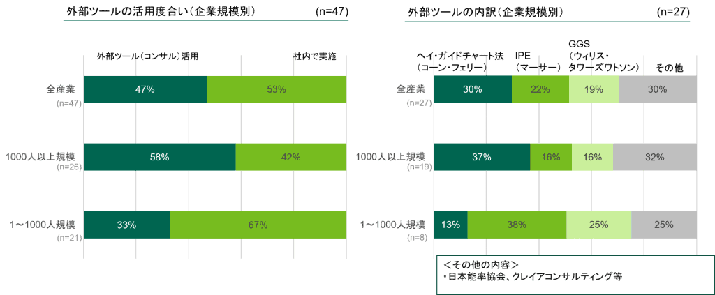 (3)職務評価の実態職務評価の実施は,大きく2 つの方法がある。1 つは,職務評価の手法を持つ組織・人事コンサルティングファームとパートナーシップを組んで行う方法,もう1つは自社内での実施である。概して,組織・人事コンサルティングファームは,職務の内容を要素分解し,個々の要素ごとに点数を付ける科学的アプローチをとる。一方で,自社内では,売上や利益,組織規模や難易度等を参考情報として,やや意思決定者の主観に寄ったアプローチとならざるをえない。企業規模によって外部活用の度合いは異なり,1,000人未満の企業では4 割程度に留まっているが,1,000人以上の企業では6割近い企業が外部活用をしている。これは,大企業ほど判断の難しい役職が多いことに加え,説明責任の観点から実績ある手法を採択する企業が多いためであろう。実際のパートナーシップ先としては,外資系組織・人事コンサルティングファーム3 社(コーン・フェリー/マーサー/ウィリス・タワーズワトソン)で約7 割を占めている(図表5)。職務評価は海外で生まれた手法であり,外資系組織・人事コンサルティングファームに知見が集積しているためでもある。これらの企業は,報酬調査も行っている点も特徴的である。各社の手法で職務価値(ジョブサイズ)を測定することで,労働市場において同等の職務価値(ジョブサイズ)の報酬水準を把握することができる。報酬制度の参照情報としても,これらの外資系組織・人事コンサルティングファームは活用されているものとみられる。