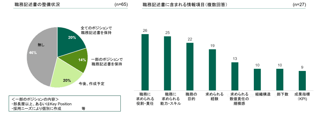 職務記述書の整備状況は,「今後作成予定」も含めて職務記述書を持つ企業と持たない企業で約半々に分かれた。ジョブ型人事制度とは,職務価値(ジョブサイズ)に基づき等級格付けし,その等級ごとに相応しい評価・報酬を実施する仕組みを指す。そのため,職務記述書を持たなくとも,ジョブ型人事制度の構築・運営は可能である。職務記述書の整備・運営は組織変更や職務内容の変更の都度,アップデートが必要になるため,大きな人事運用の負荷になりうる。海外では,職務記述書は採用時や配置転換時に示すことが求められる重要なアイテムであり,現場マネジャーのリテラシーも高い。しかし,日本企業では,職務記述書をもとにコミュニケーションをとるビジネス慣習はなく,現場マネジャーのリテラシーも低い。そのため,導入時に多大な工数をかけて整備したものの,形骸化してしまうケースも少なくない。一方で,職務記述書を持つことで,職務価値(ジョブサイズ)の納得性を高め,組織内で各メンバーの役割を明確にするメリットも得られる。職務記述書を持つか,持たないかについては,投入する工数と得られるメリットを十分に検討したうえで,判断する必要があるだろう。職務記述書に含まれる情報としては,「職務に求められる役割・責任」「職務に求められる能力・スキル」「職務の目的」がトップ3 に挙げられた。これらの情報項目は,その職務は何のために(職務の目的),何を責務として(職務に求められる役割・責任),どのような人材が遂行すべきか(職務に求められる能力・スキル)を明らかにするものである。このような情報を職務記述書に載せることにより,単に職務価値(ジョブサイズ)の妥当性を示すだけではなく,人材育成に活用可能なものにすることができる(図表4 )。