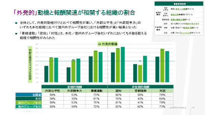 海外に比べると国内は、金銭的なところに関しては相関が少ないが、非金銭のところは、5割近くある組織が多い。金銭のところは、国内のグループ会社は、内発的なところには多かった。