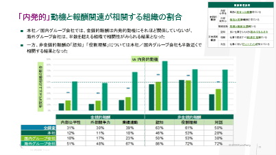 結果を見ると「内発的」動機と報酬関連が相関しているとわかる。グラフを見ると、左から濃い緑が本社組織、黄緑が国内グループ会社、緑が海外グループ会社となり、金銭的報酬に関しては、国内企業は相関している企業数は多くないが、海外グループの場合は半数を超える組織で相関がみられた。一方、非金銭報酬では、認知、役割理解に関して国内の企業の半数近くに相関性が見られた。全体的に海外のグループ会社においては、金銭、非金銭関わらず、5割以上の組織が内発的動機という設問に対し、プラスの相関があるという結果になった。