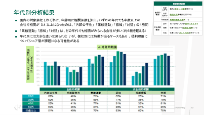 次に国内の組織のみで実施した年代別の分析結果について解説した。年齢という切り口で均等にデータが取れるため、国内の対象会社それぞれの年齢別に相関係数を算出した。