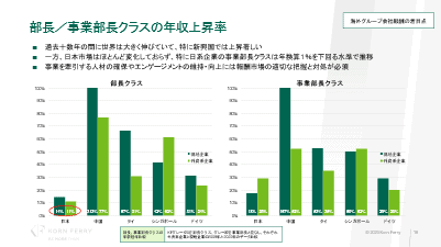 さらに着目したい点は、グラフの赤い点線部分。これは部長クラスと事業部長クラスの日本企業における日本報酬水準の線だが、ほとんど差がないことが分かる。ジョブサイズ、役割が大きくなっているにも関わらず、このギャップが非常に小さい。要因の一つに、国内の役員報酬がグローバルと比較しても低いので、役員報酬が上がらないと、事業部長クラス上がらないということ。国内役員報酬に関しては、国内企業同士で比較する傾向が強く、グローバルとの開きが大きくなり、デフレ経済による低い昇給率が長く続いてより低くなっている状態だと言える。