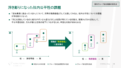 本社からの出向者、グループ会社の正社員、グループ会社の契約社員の仕事を「職務価値」に置き換えた時に課題が明確になる。同じ仕事をしているにもかかわらず、雇用背景や雇用された人事制度によって給与に差が生じているのだ。これにより社員に不公平感を招いてしまい、士気が低下してしまいかねない。金銭的報酬が衛生要因として機能することは最低限必要であり、早急な対応が求められている。