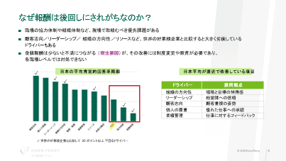 左の棒グラフは、エンゲージメントに寄与したドライバーについて、どのくらいの日本国内社員が肯定的に回答したかを示している。報酬は3番目に肯定的回答率が低い。ただ、協力体制や組織体制など、各職場でもっと優先するべき課題があることが、そのひとつの要因だ。また、左のグラフ内「✓」マークがついているのは、世界の好業績企業と比べた時に日本が大きく劣後しているドライバーで、顧客志向、リーダーシップ、組織の方向性、リソースなどがあがっている。このような優先度が高い領域に企業が取り組んでいる結果でもあるが、右の表にある「日本平均が直近で改善している項目」を見ると、組織の方向性、顧客志向などがある。報酬に関する肯定回答率は低いものの、その見直しや改善には制度変更や長期的な原資も必要ということで、施策としての優先順位が低くなりがちであることがデータから分かる。