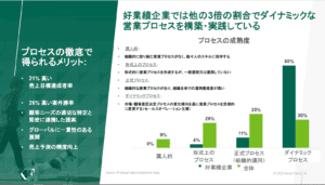 コーン・フェリーの調査によると、好業績企業は他の企業と比べて3倍の割合でダイナミックな営業プロセスを構築し、徹底的に組織で実践している。このようなプロセスを徹底している企業では、そうでない企業に比べ個人の売上目標達成割合は21%高く、案件勝率も26%高い。