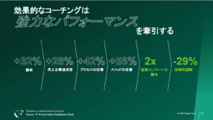 面白いのは、コーチングを効果的に行うと、営業メンバーの一つ一つの案件に関わる関与率が上がることだ。そうなると信頼関係が構築され、自発的な退職もそれを行っていない企業より低い傾向もみられる点である。