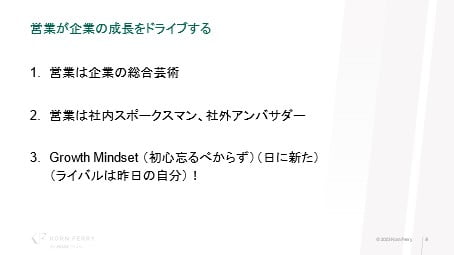 これら営業のマインドセットは本当に重要で、社内で良い成績をあげる、お客様に価値を提供するだけではなく、営業の人たちのキャリアを安定させることに繋がる、と綱島氏は言う。