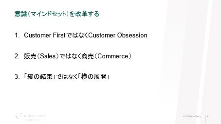 1つ目、カスタマー・ファーストを標榜する会社は多いが、本当に実践できている企業はそれほどないのではないか、と綱島氏は問いかける。実践する企業の一つとして挙げるのが、カスタマー・オブセッションという言葉を掲げているAmazon社だ。Obsessionには「とりつく」「徘徊する」などややおどろおどろしい意味がある。綱島氏は自身が証券会社で営業を担当していた当時、先輩に言われたことを引き合いに出した。その先輩は会社から課されたノルマよりも、お客様との関係作りを何よりも大切にしていた。「お客様は日々の株価変動の報告に興味があるのではない。そんなことはご自身でも見ている。お客様が本当に知りたい情報をお伝えするために自分は一生懸命仕事をしている」と。お客様に言われたことに反応するのではなく、お客様が本当に何を望んでいるかを考え先に動くこと。つまり、顧客起点の意識(マインドセット)を持つことが本当に重要だと語る。