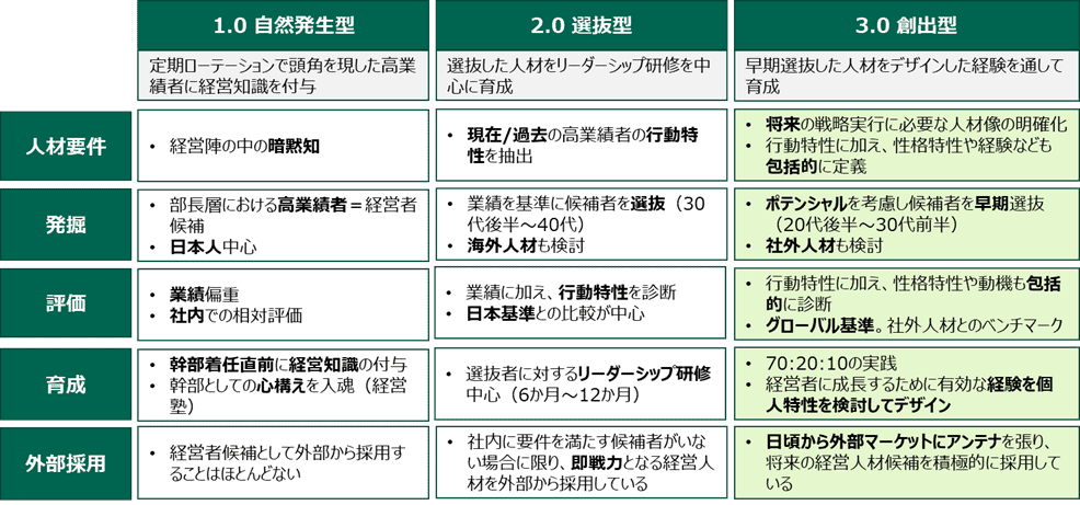 本調査に先立ち、コーン・フェリーでは「経営人材育成3.0 ~日本企業における次世代経営人材発掘・育成アプローチの推移~」という基本フレームをまとめました。次世代経営人材の発掘・育成のアプローチを変革し業績向上につなげた海外先進企業の取り組みから「型」を抽出し、人材要件、発掘、評価、育成、外部採用という5つの観点から次世代経営人材の発掘・育成の進化ステージを体系化したモデルです。