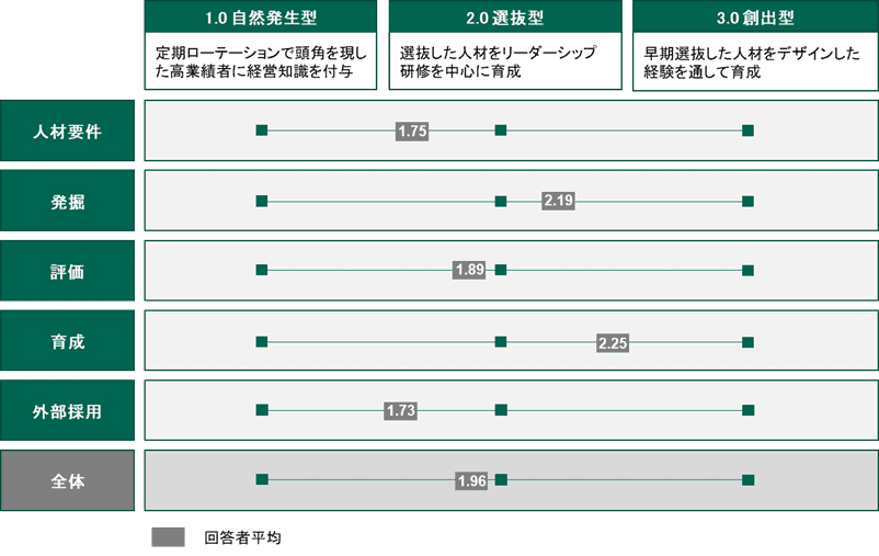 約8割の企業が候補者プール(候補人材の蓄積)を構築しており、総合職全員を経営人材候補と位置づけ一律的な対応をしてきた従来のアプローチからのシフトが進んでいる。経営人材候補者プールを持つ企業のうち約半数が30歳代前半までに最初の選抜を行っているが、経営人材育成施策の早期化は世界的な傾向。