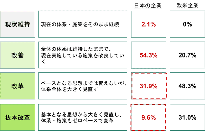 回答企業の41.5%が大幅にアプローチを変えようとしている。ただし、欧米企業に比べると改善レベルの割合が高く、改革や抜本改革にまでは至っていない。