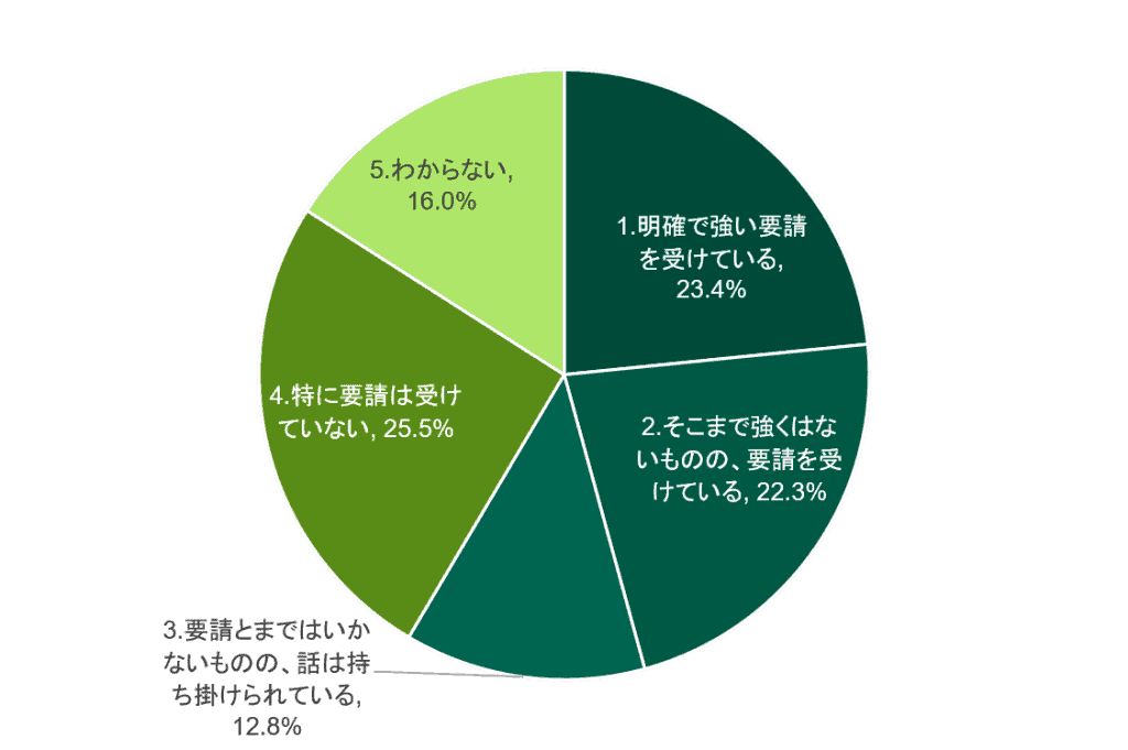 経営陣が取り組みを主導するとした回答企業が55.3%と前回調査(2016年)より経営陣の関与が強まっている。また、回答企業の58.5%が社外取締役からの要請・依頼を受けている。