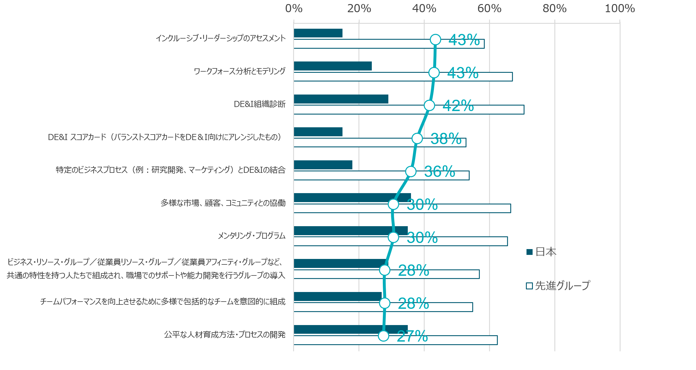 7. 現状分析から始めよDE&I推進グループの6~7割は、アセスメントや診断ツールを活用したデータによる現状把握や分析を実施または実施予定である点、そして、DE&Iを組織の構造的プロセスにまで統合していく点などが、日本企業の取り組みの現状と大きく異なっている。