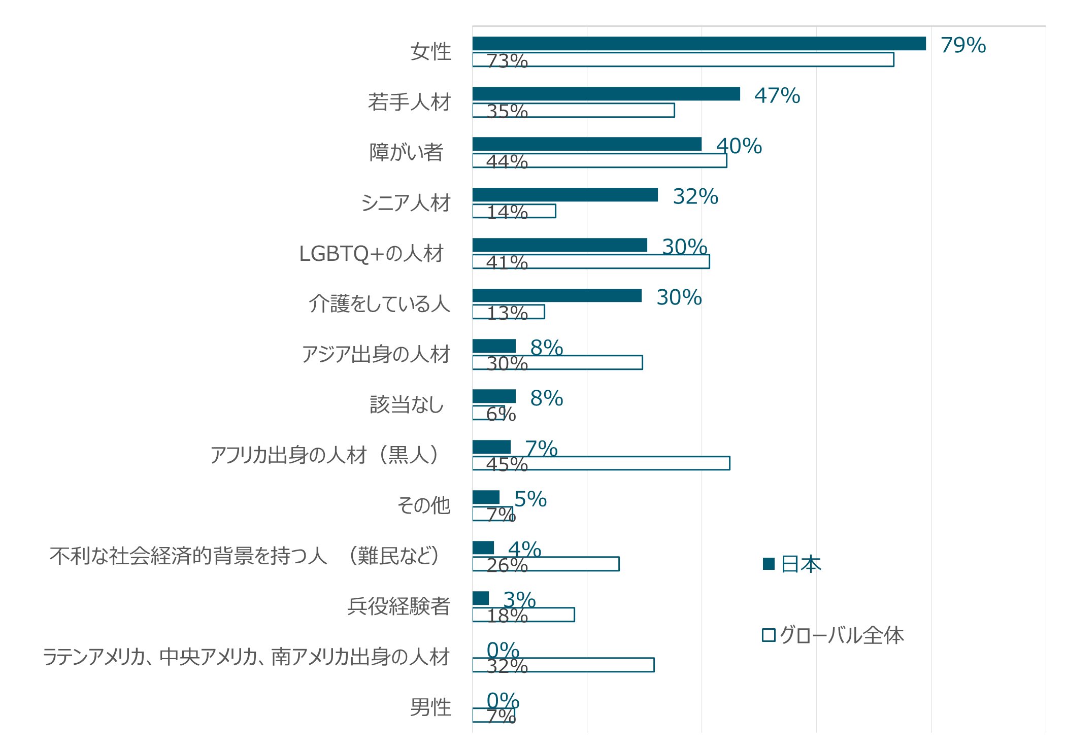 2. 女性だけではない、過小評価されがちな人材組織において優先事項となっている「過小評価されがちなグループ」については、グローバル全体と日本の結果は共通して「女性」がトップとなった。また、日本の回答上位5項目に「若手人材」と「シニア人材」が入った。超高齢化社会を迎える日本において双方のバランスをとる難しさが伺える。その他に過小評価されているグループとして、「中途社員」「学歴」をあげた日本の回答者がいたのは日本独特の傾向となった。
