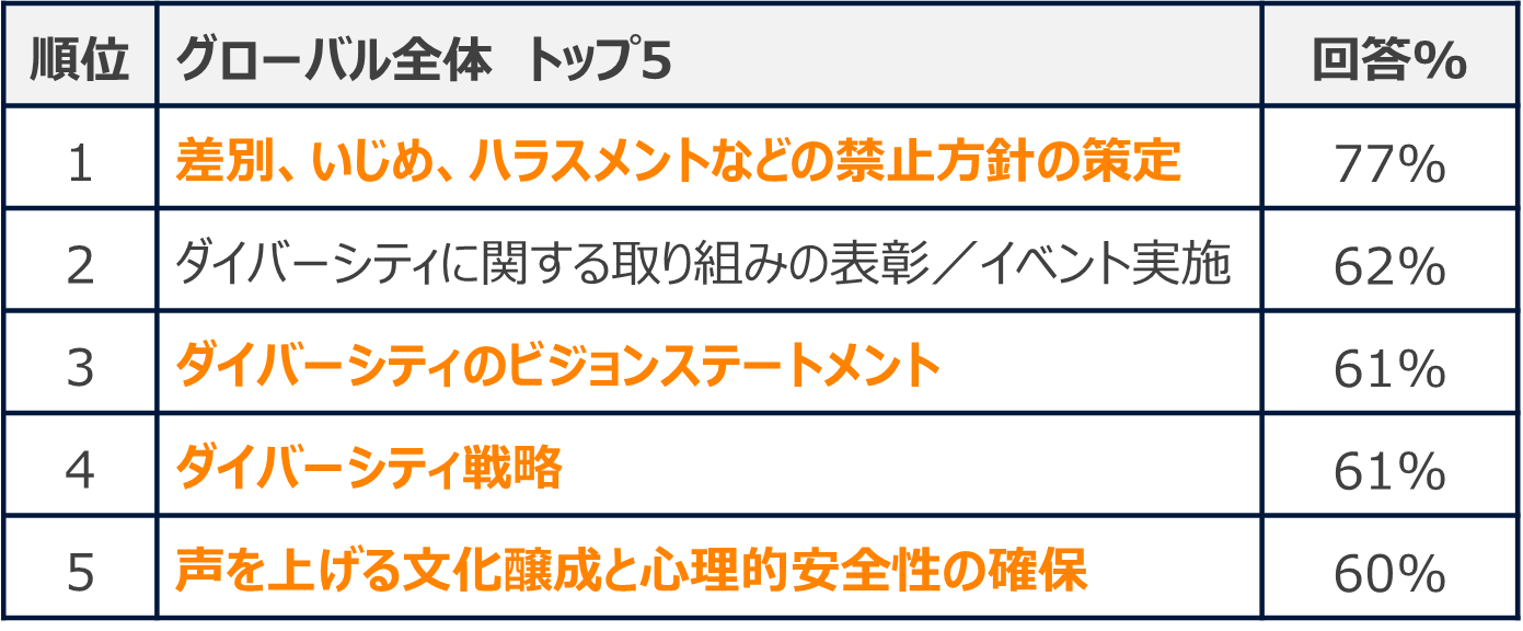 1. 取り組み加速も、世界とは大きなギャップが日本に本社を置く組織に所属している回答者の77%が、過去12か月において自組織のDE&Iの取り組みは「加速した」と回答。一方、「大幅に加速した」と回答したのは20%に留まり、グローバル全体の43%と比較して低い割合となった。DE&Iに関する取り組みは日本企業に広がりつつあるものの、グローバル全体のスピード感とは大きな隔たりがある。