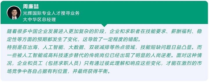 中国招聘领域专家也认同这一观点:由于各种内外部因素的影响,中国职场也经历着一场重要的调整。不论求职者还是在职员工,都在审视自身的竞争力,同时对工作的期望和需求也发生了巨大的变化