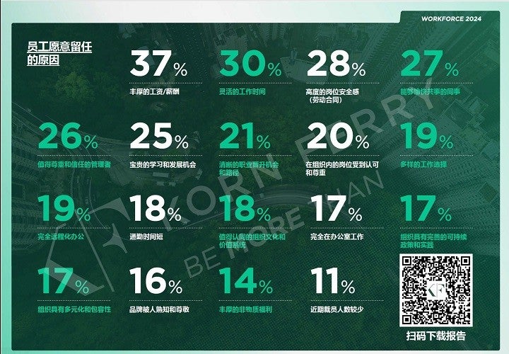 调研显示,工作时间的灵活性(33%)、丰厚的薪酬(31%)和高度的岗位安全感(26%)是员工愿意努力工作并留任的主要驱动因素。